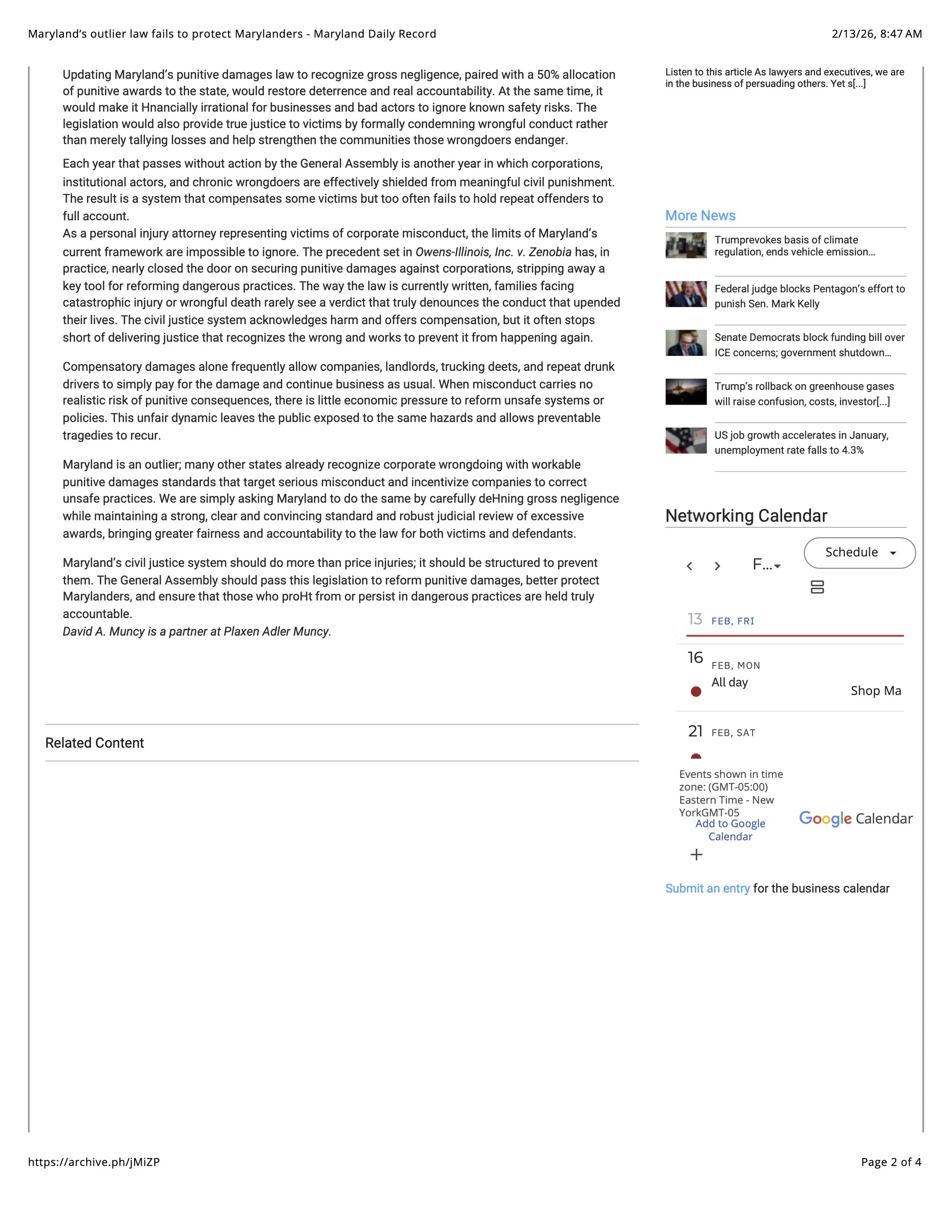 Maryland’s outlier law fails to protect Marylanders - op-ed Feb 13 Written By Madeline Brice Via The Daily Report by David A. Muncy Madeline Brice